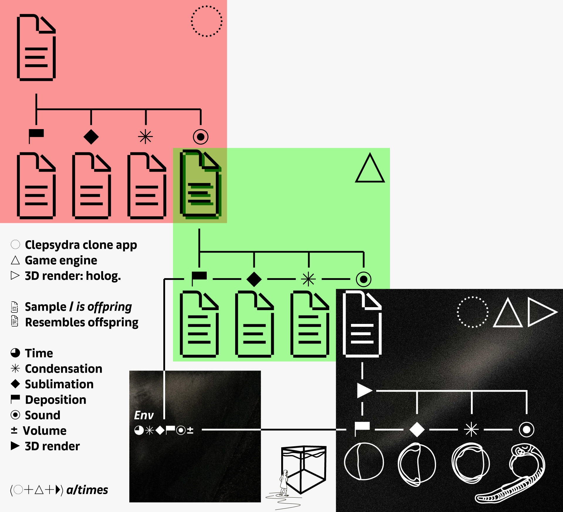 A large set of incomplete early data, records and speculation from what Cambria marine life looked and behaved like (hand-drawn illustrations, photographs, hand-made models, fabules, children’s books, etc) is used as the basis for a software to guide itself on a digital cloning evolutionary process reconstruction guess, the output along with other technical inputs (rendering aggregated misalignments, multistage entanglements, data reshuffle, etc) will be used by a game engine to produce an equivalent 3D arresting simulacra, and as these processes occur, they will manifest in changes in the levels of sublimation, condensation, and deposition within an exhibition hall: A software and system as mad as the evolutionary mystery needs it to be, or as mad as it needs to become, and/or as mad as it can be.